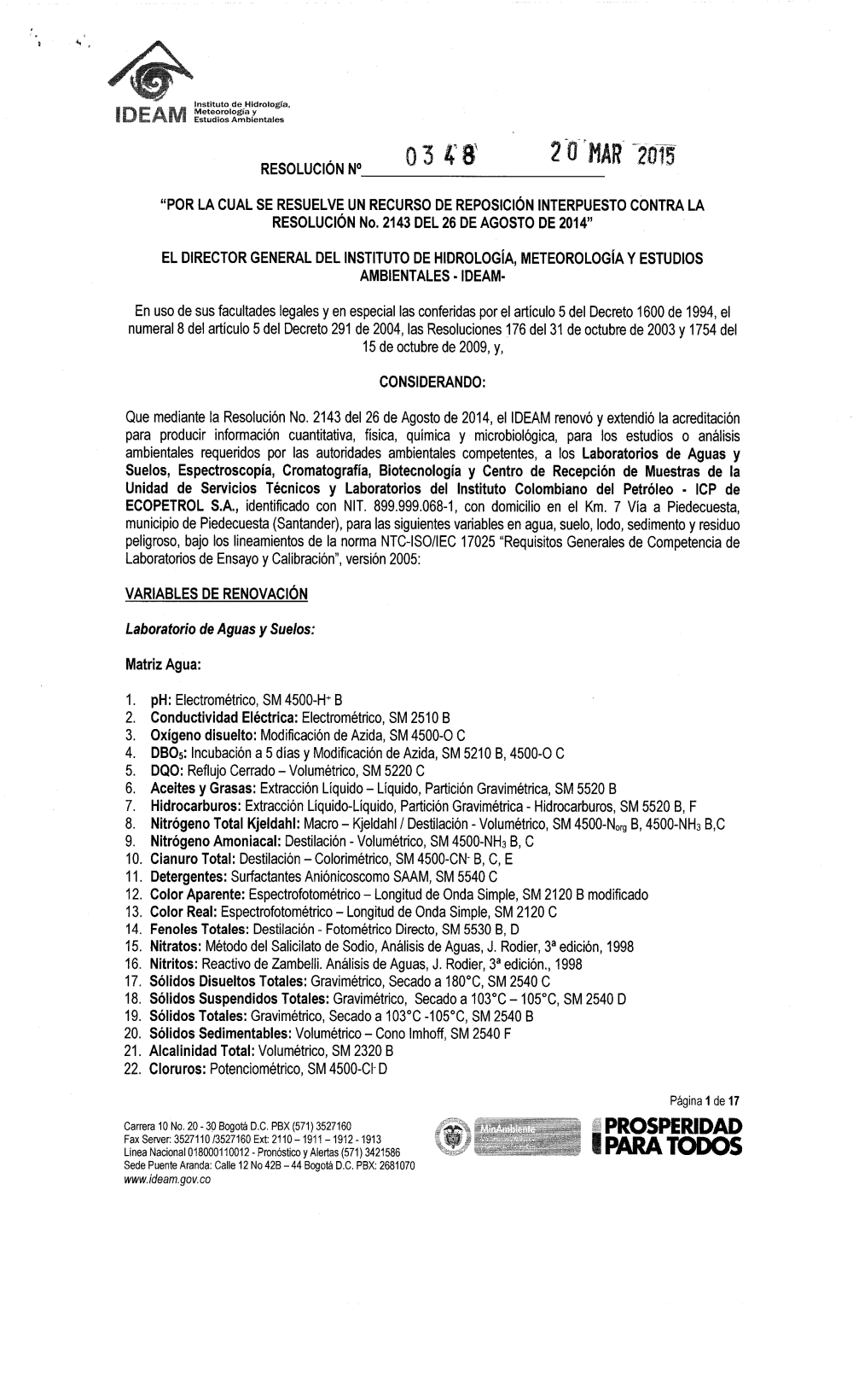 Laboratorios acreditados por el Instituto de Hidrología, Meteorología y Estudios Ambientales, IDEAM, bajo los lineamientos de la norma NTC-ISO/IEC 17025 ¿Requisitos Generales de Competencia de Laboratorios de Ensayo y Calibración¿, y según lo estipulado en el Decreto 1076 de 2015, ¿Decreto Único Reglamentario del Sector Ambiente y Desarrollo Sostenibles¿ artículo 2.2.8.9.1.7.