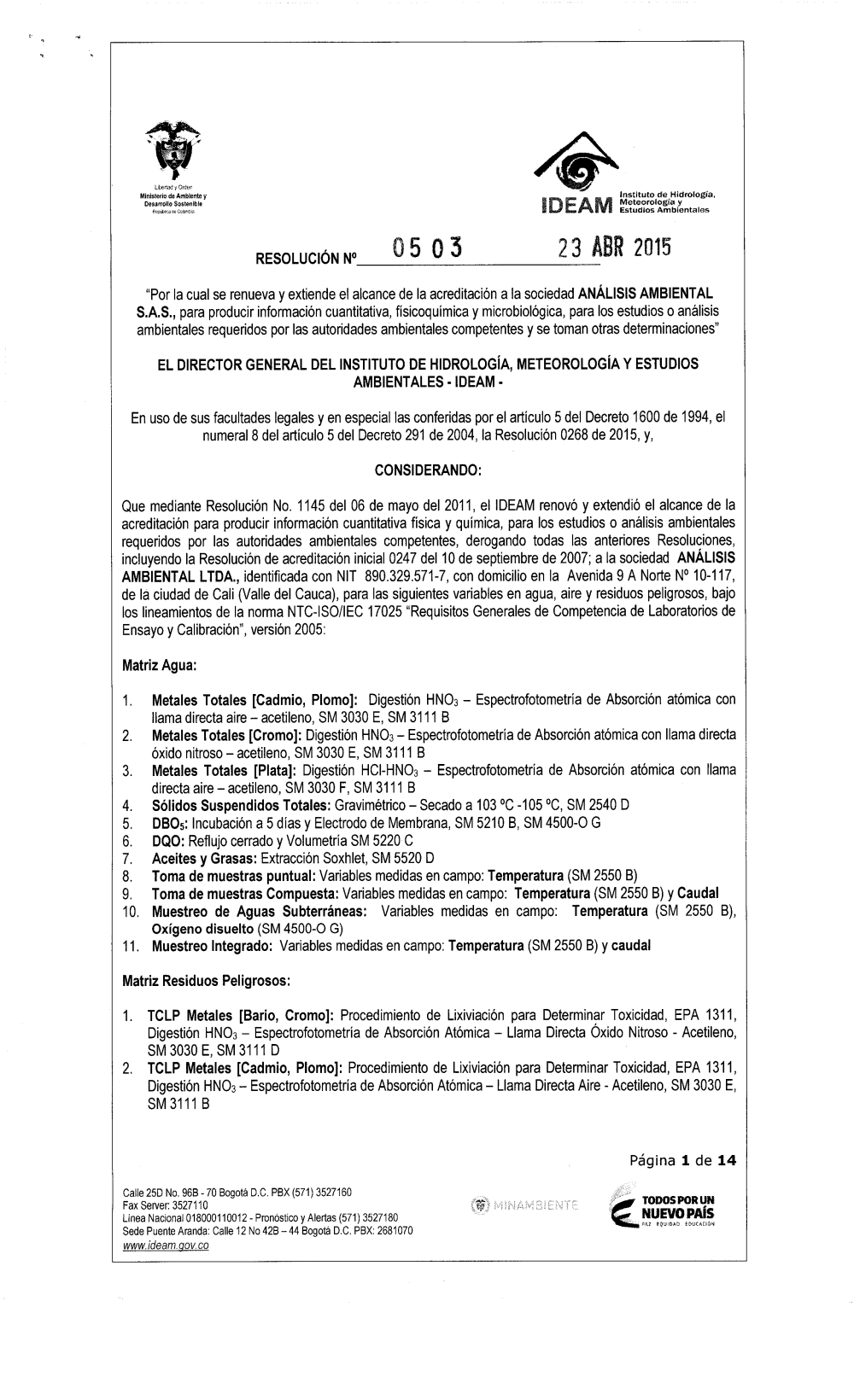 Laboratorios acreditados por el Instituto de Hidrología, Meteorología y Estudios Ambientales, IDEAM, bajo los lineamientos de la norma NTC-ISO/IEC 17025 ¿Requisitos Generales de Competencia de Laboratorios de Ensayo y Calibración¿, y según lo estipulado en el Decreto 1076 de 2015, ¿Decreto Único Reglamentario del Sector Ambiente y Desarrollo Sostenibles¿ artículo 2.2.8.9.1.7.