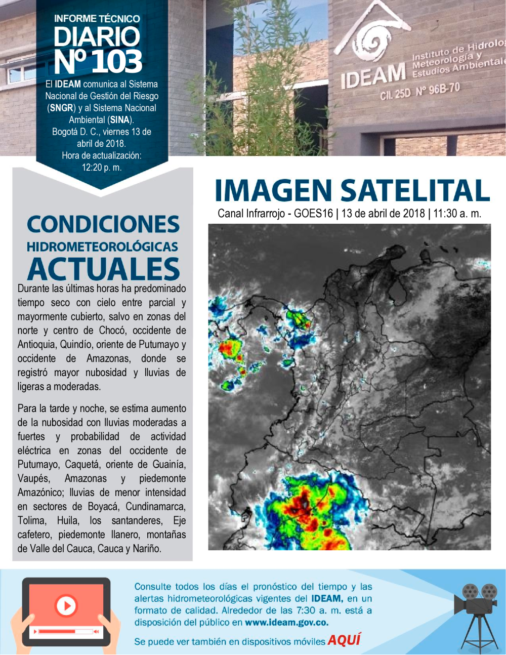 El IDEAM, pone a disposición del Sistema Nacional para la Prevención y Atención de Desastres (SNPAD), el Sistema Nacional Ambiental (SINA) y la comunidad en general, el informe técnico diario de alertas ambientales de origen hidrometeorológico; de Igual manera, se pueden consultar los informes anteriores. En caso de eventos extraordinarios que puedan ser detectados por nuestra red ambiental, se publicará un comunicado especial. Se debe tener en cuenta que esta es una información indicativa de orden nacional; para situaciones puntuales favor remitirse a los comunicados que emitan los Comités Locales y Regionales de Prevención y Atención de Desastres.